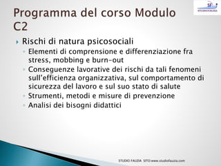 Il corso di 24 ore sui rischi psicosociali approfondisce stress, mobbing e burn-out, analizzando le loro conseguenze sulla salute e l'efficienza organizzativa. Viene discusso il concetto di eustress e distress, con focus sui sintomi psicologici e psico-somatici degli individui. Il documento sottolinea l'importanza di valutare oggettivamente le fonti di stress nel contesto lavorativo.