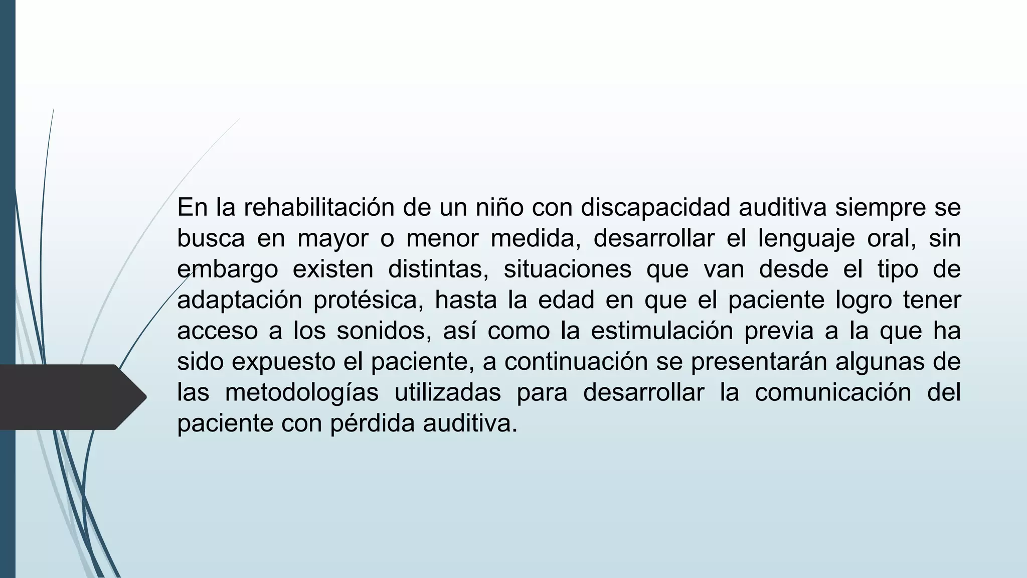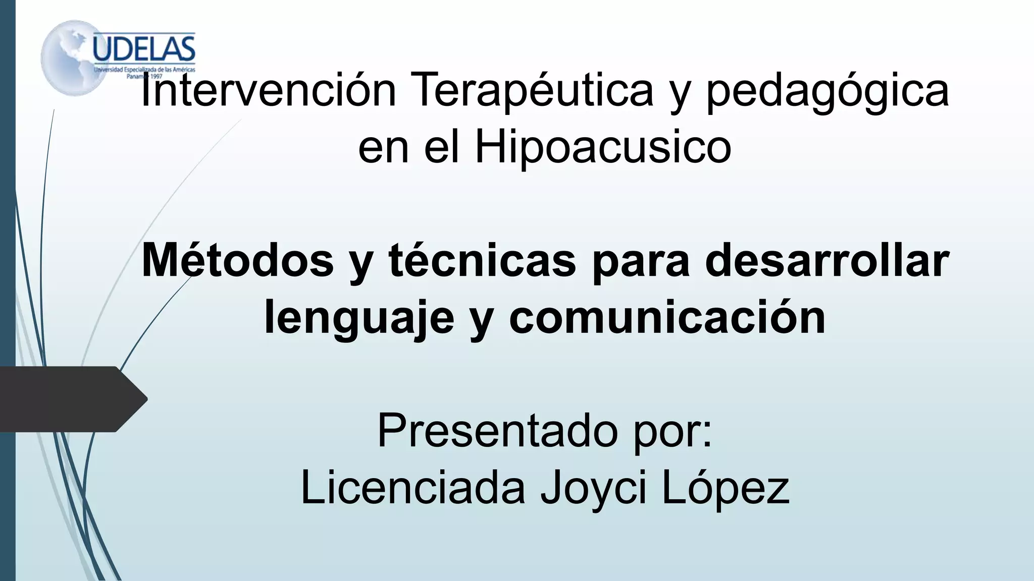 Este documento presenta diferentes métodos y técnicas para desarrollar el lenguaje y la comunicación en personas hipoacúsicas. Describe el modelo auditivo oral que promueve el lenguaje hablado a través de la audición usando audífonos o implantes cocleares. También describe el método verbotonal que se enfoca en mejorar la orientación espacial y la comprensión auditiva. Finalmente, presenta el modelo bilingüe bicultural que reconoce la lengua de señas y permite que las personas sordas aprendan un segundo idioma es