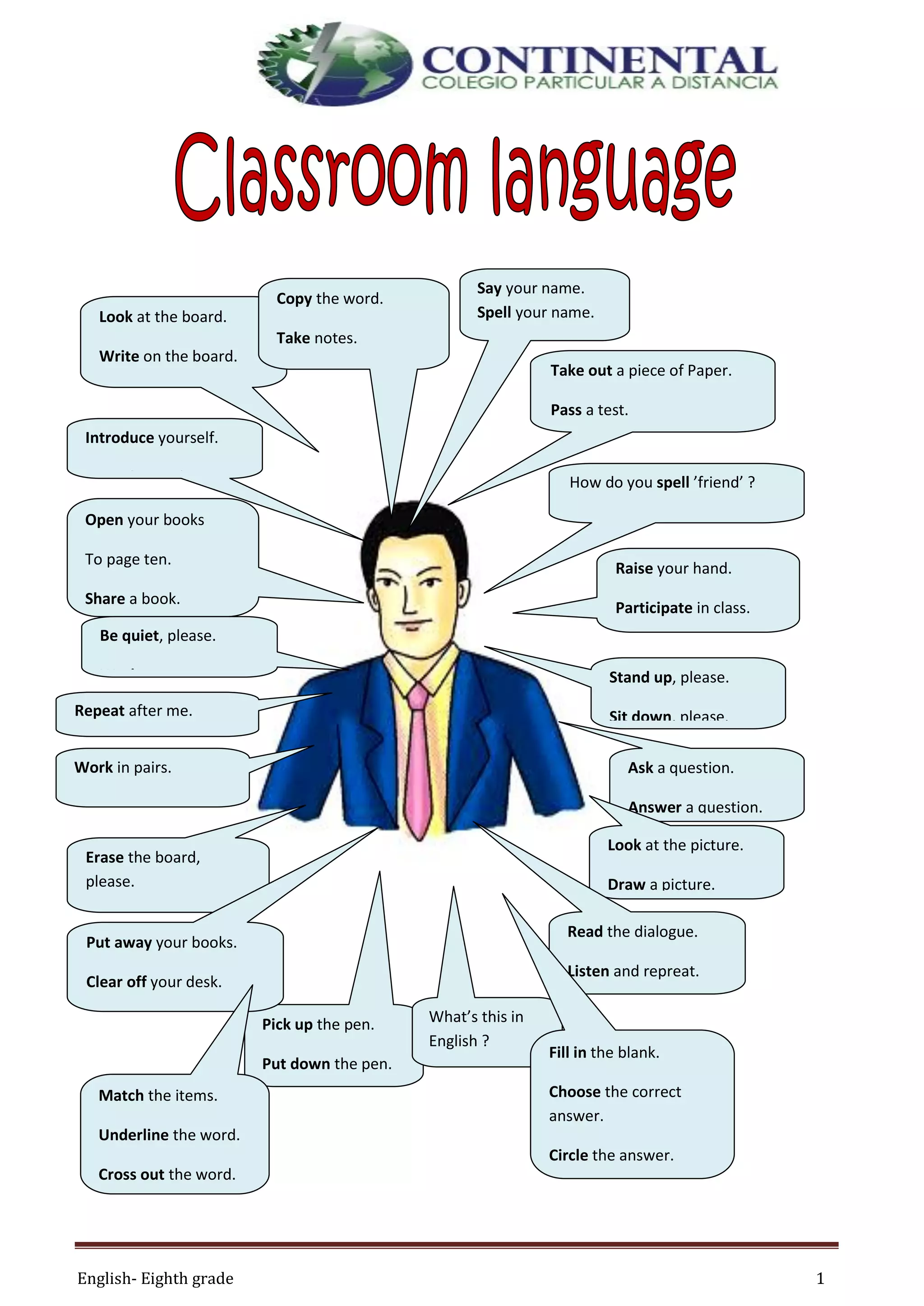 This document provides vocabulary and classroom instructions related to learning English as a foreign language. It includes directions for students to introduce themselves, participate in class activities, and complete tasks like spelling words, answering questions, and filling in blanks. It also covers lessons on the alphabet, numbers, time, colors, days of the week, weather, and seasons.
