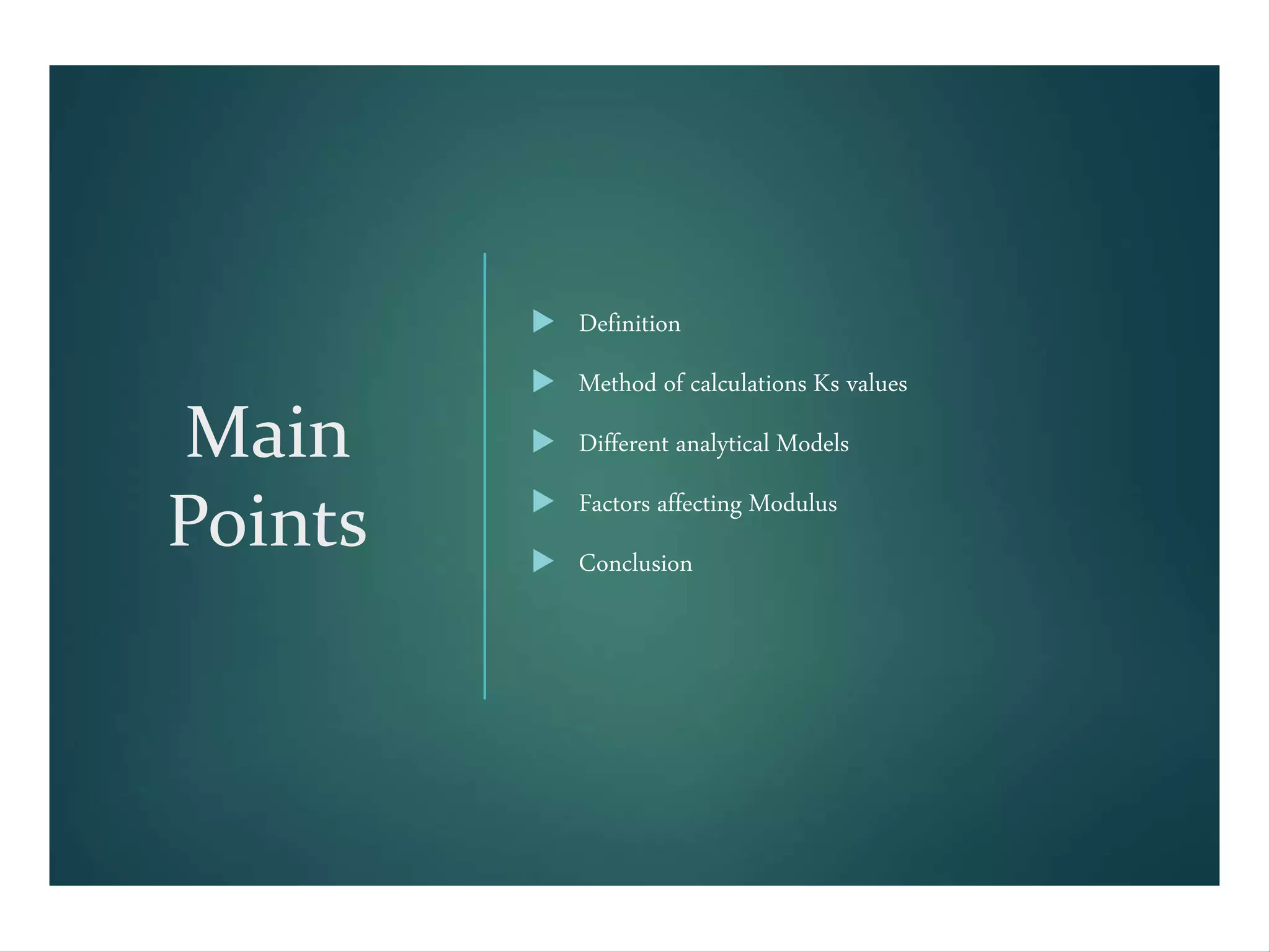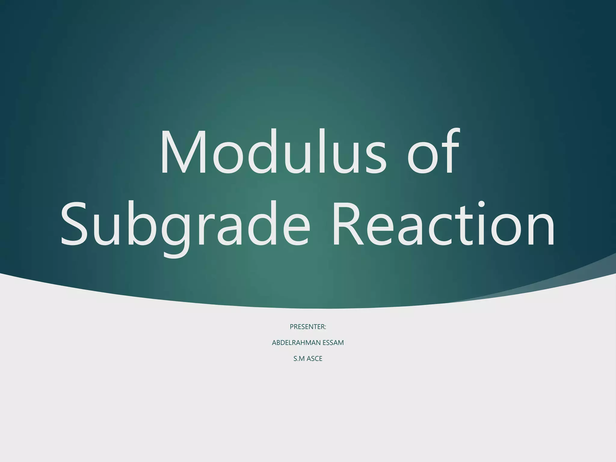 This document discusses the modulus of subgrade reaction (Ks), which represents the relationship between applied stress and associated soil settlement beneath foundations. It defines Ks and describes several analytical models and methods for calculating Ks values, including plate loading tests, correlations with soil properties, and pseudo-coupled approaches that assign different Ks values depending on location beneath the foundation. Factors that influence Ks include soil type, moisture content, and foundation geometry.