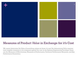 The document outlines various measures to evaluate product value against its cost, focusing on measures of effectiveness (MOEs), performance (MOPs), key performance parameters (KPPs), and technical performance measures (TPMs). MOEs relate to mission success, while MOPs and KPPs assess performance attributes important for meeting design requirements and customer needs. TPMs track design progress and identify technical risks, ensuring systems meet operational objectives.