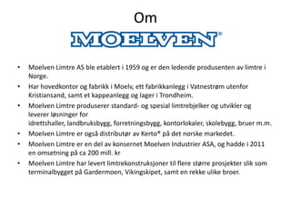 • Moelven Limtre er en del av konsernet Moelven Industrier ASA, og hadde i 2011