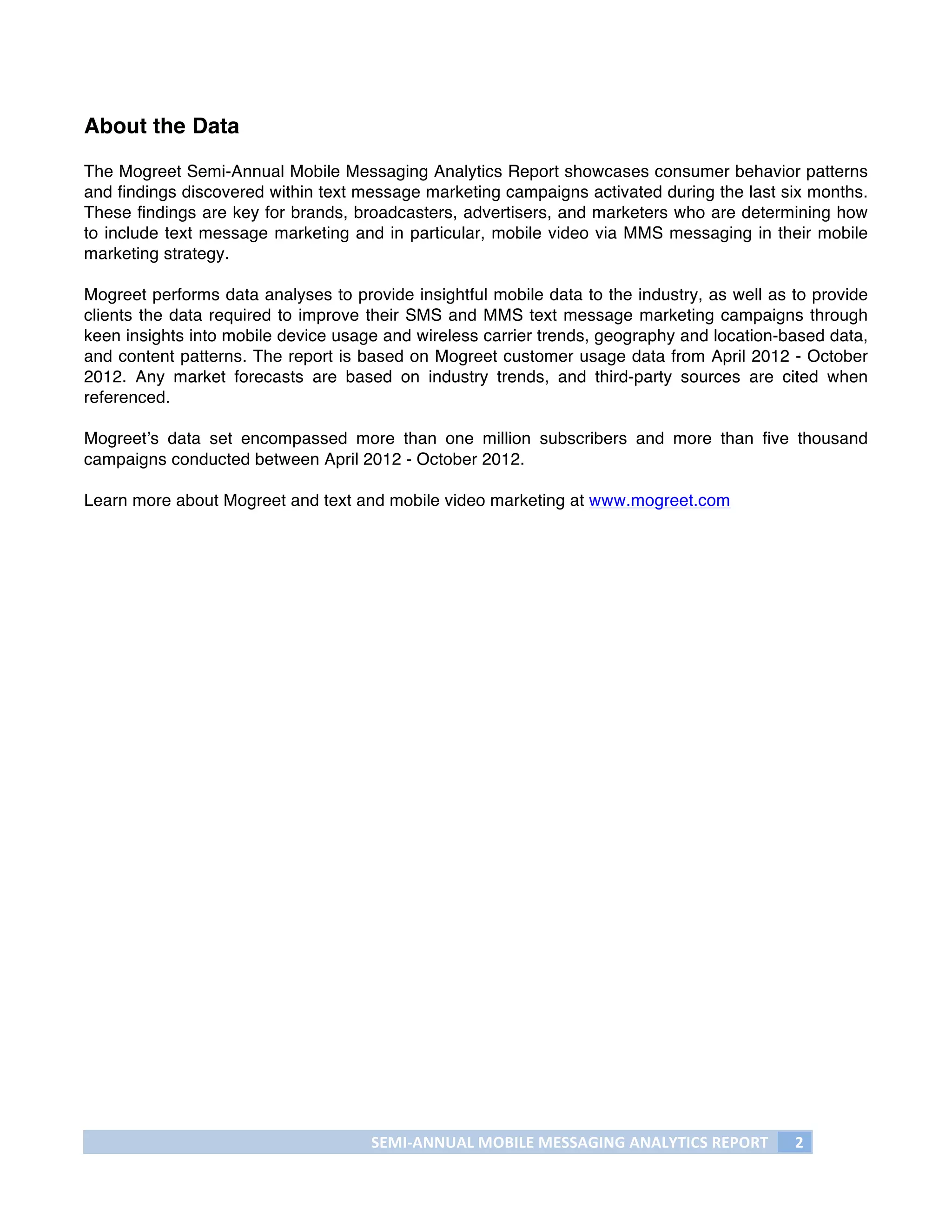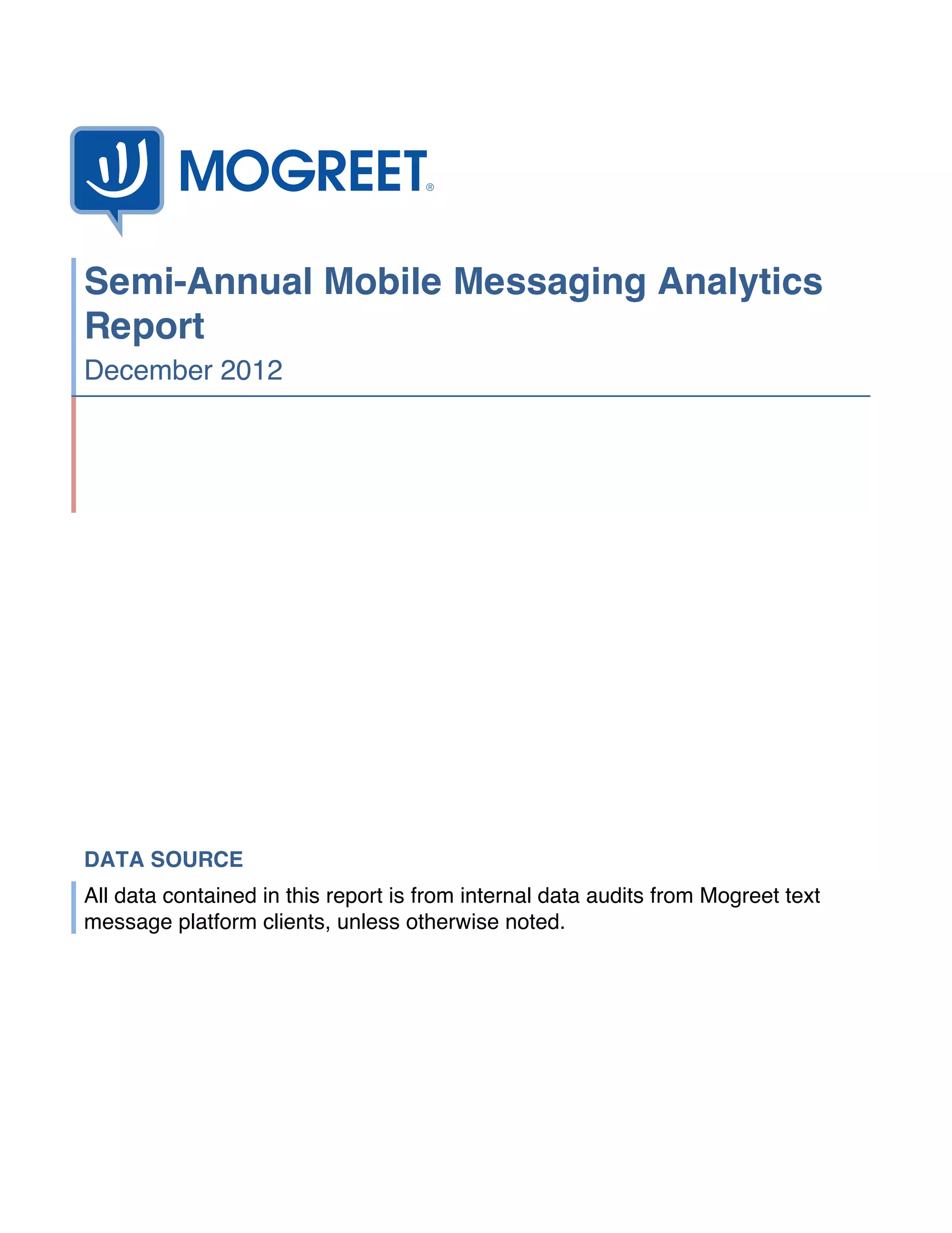 The Mogreet Semi-Annual Mobile Messaging Analytics Report provides insights into consumer behavior patterns in text message marketing from April to October 2012, highlighting the impact of smartphone adoption on messaging trends. Key findings indicate significant growth in multimedia messaging (MMS) usage, particularly among Apple and Samsung users, while competition in the wireless carrier market is intensifying. The report emphasizes that engaging consumers through multimedia content in text messaging offers marketers a promising return on investment in their campaigns.
