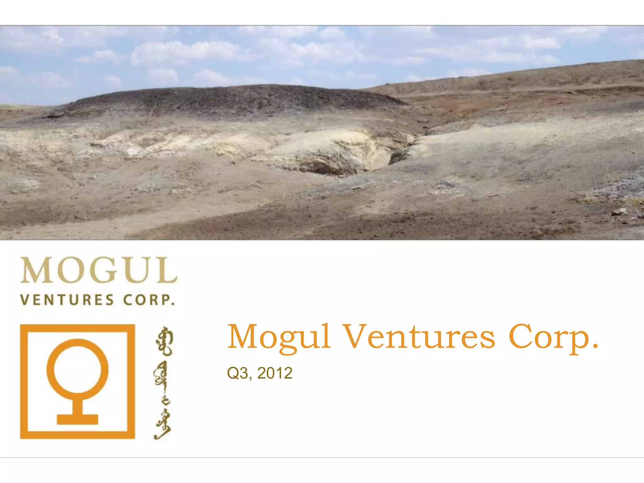 Mogul Ventures Corp focuses on exploration and development of thermal coal assets in Mongolia. It has established an initial inferred resource of 89.6 million tons at its Ovdog Hudag deposit based on drilling. The company plans additional drilling to expand resources with the goal of advancing the project towards production. Mogul leverages local expertise and a strategic location near infrastructure to pursue growth opportunities in Mongolia's thermal coal sector.