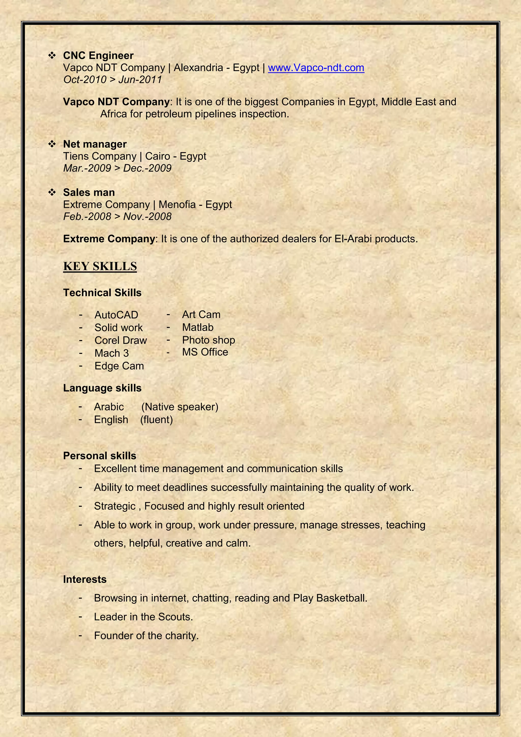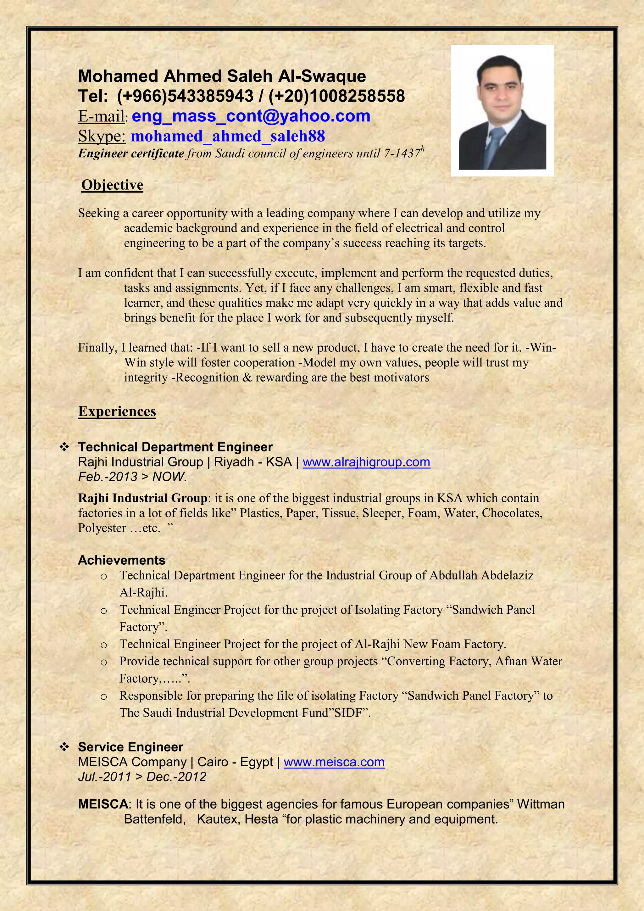 Mohamed Ahmed Saleh Al-Swaque is seeking a career opportunity in electrical and control engineering. He has a bachelor's degree in electronics engineering from Menofia University in Egypt and is currently studying for a master's degree in mechatronics and robotics. His experiences include working as a technical department engineer, service engineer, CNC engineer, and sales roles. He has skills in AutoCAD, Solidworks, PLCs, and languages like English and Arabic.