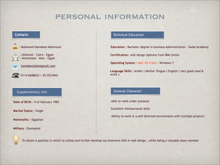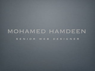 Mohamed Hamdeen is a senior web designer based in Cairo, Egypt with over 4 years of experience designing websites. He has a bachelor's degree in business administration and a web design diploma. He is proficient with tools like Photoshop, HTML, CSS, jQuery, and creating responsive layouts. Some of his recent projects include book-store websites, schools sites, TV networks, and more. His skills also include web optimization, video/photo editing, and presentation creation. He is seeking a web design position where he can continue developing his skills.