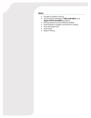 Mohamed Shain is a Sudanese chemical engineer seeking a position that allows him to learn and grow. He graduated from the University of Science and Technology in Sudan with honors and a 3.67 GPA. Currently he works as a refinery trainer at Savola Edible Oil Company, where he is responsible for daily production targets, shift reports, and chemical preparation and inventory. Previously he completed a training program at El Obied Refinery Company focused on safety, operations, maintenance, and instrumentation.