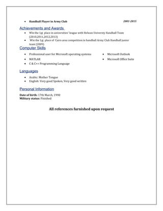Mohamed Anwar El-Sayed Mohamed is seeking a challenging career where he can develop his technical, knowledge and communication skills. He has a BSc in Mechanical Mechatronics Engineering from Helwan University. Currently he works as a Quality Control Engineer at HEE SUNG Electronics, ensuring customer satisfaction and conducting root cause analysis. He has experience in embedded systems, PLC systems, and maintenance training.