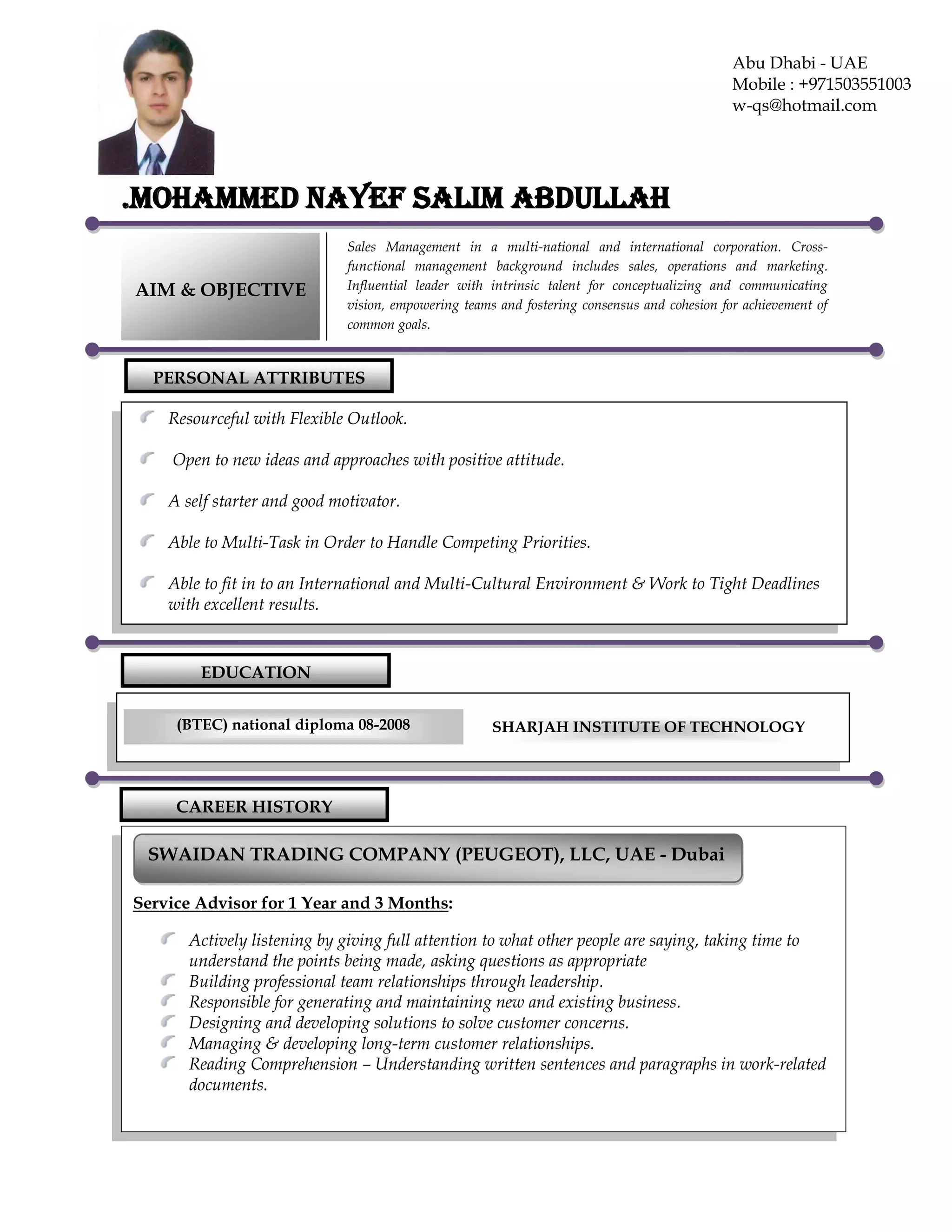 Mohammed Nayef Salim Abdullah is an experienced sales advisor with a multi-functional background in sales, operations, and marketing, specializing in maintaining customer relationships and addressing automotive concerns. He has worked for various automobile companies for over seven years, focusing on problem sensitivity, customer service, and enhancing organizational reputation. Abdullah holds a BTEC National Diploma and possesses strong communication skills in both Arabic and English.