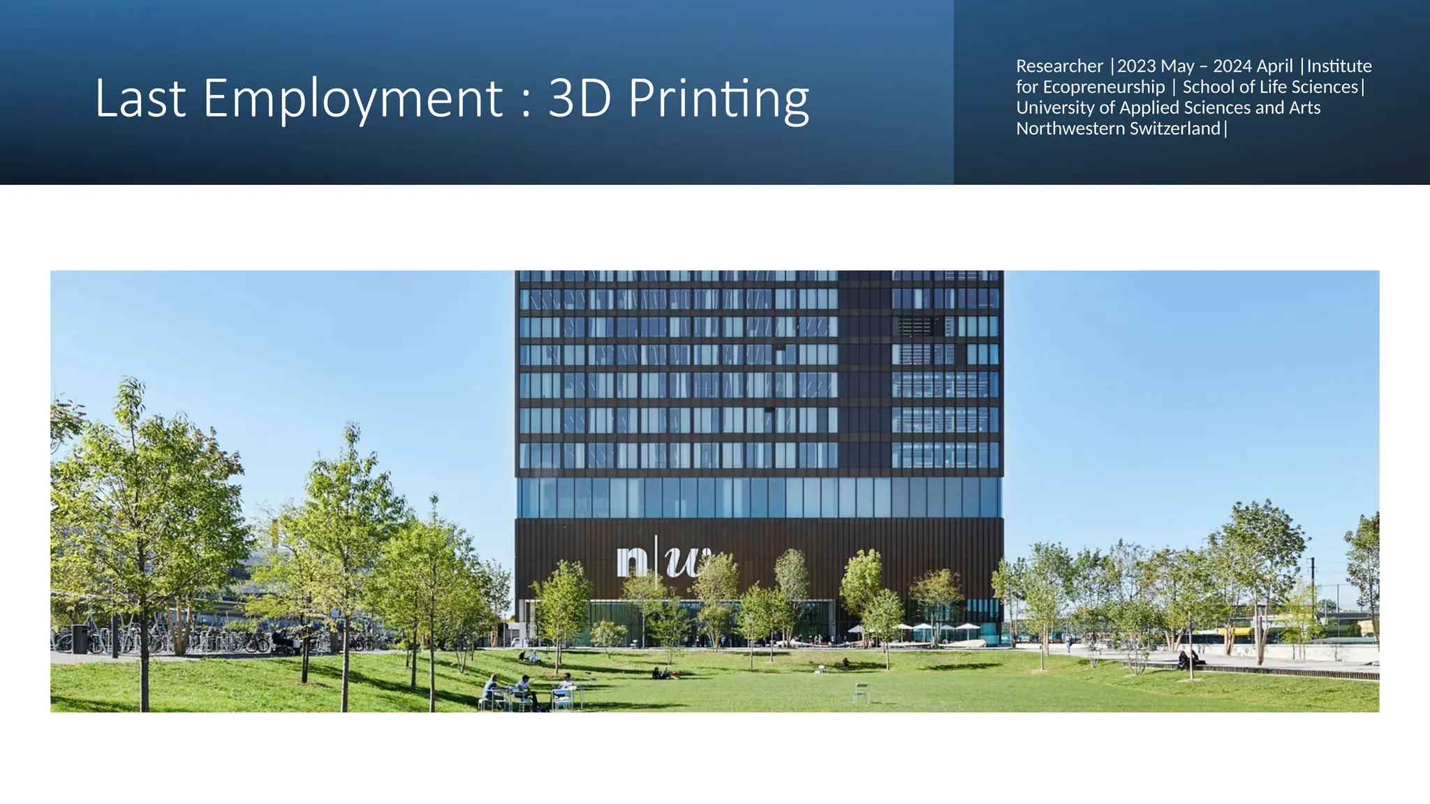 My experience as a Researcher at the Institute for Ecopreneurship, University of Applied Sciences and Arts Northwestern Switzerland, provided me with valuable experience in bioink preparation, encompassing synthesis, bioprinting, chemical characterization, and biological testing. Prior to that, as an Additive Manufacturing Specialist at the University of Tartu, I was involved in the entire 3D printing process, from design and slicing to printing, repair, and maintenance. I also enjoyed mentoring master's students, further developing my communication and leadership skills.