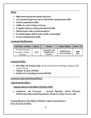Mohammad Jetawe is seeking an administrative position where he can utilize his skills. He has a bachelor's degree in administration and marketing and over 5 years of experience in administrative roles. His experience includes working as an administration officer for National Bank of Abu Dhabi where he opened accounts and processed transactions. He also has experience working as an administrative assistant for a tent company, managing schedules, contracts, and communications.
