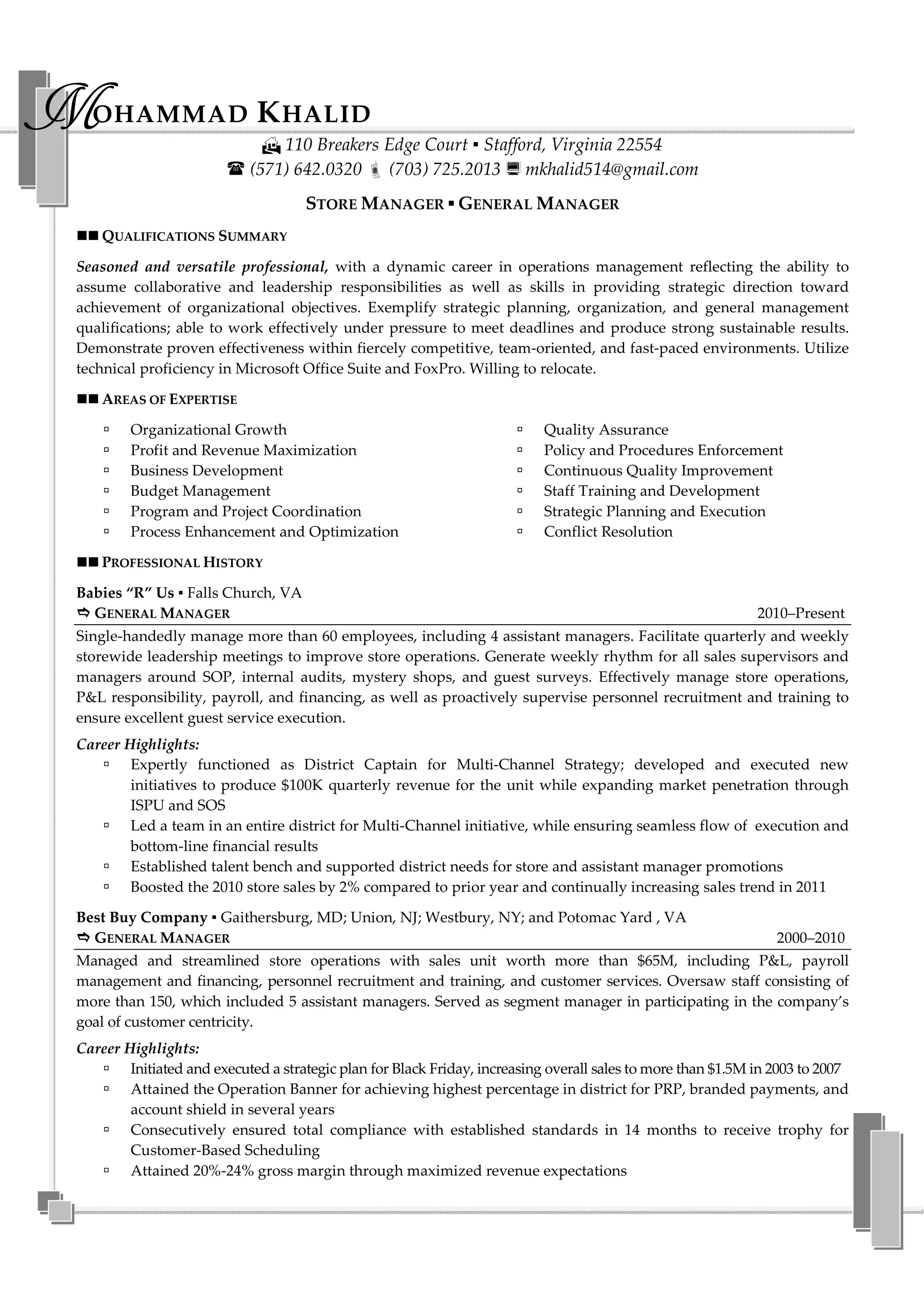 Mohammad Khalid is a seasoned store manager and general manager with over 25 years of experience in operations management. He has a proven track record of strategic planning and leadership to achieve organizational objectives. Currently, he is the General Manager of Babies “R” Us in Falls Church, VA, where he single-handedly manages over 60 employees and drives quarterly sales increases. Previously, he held general manager roles at Best Buy for 10 years, managing stores with sales of over $65M. He has extensive expertise in areas such as organizational growth, quality assurance, budget management, and staff training.
