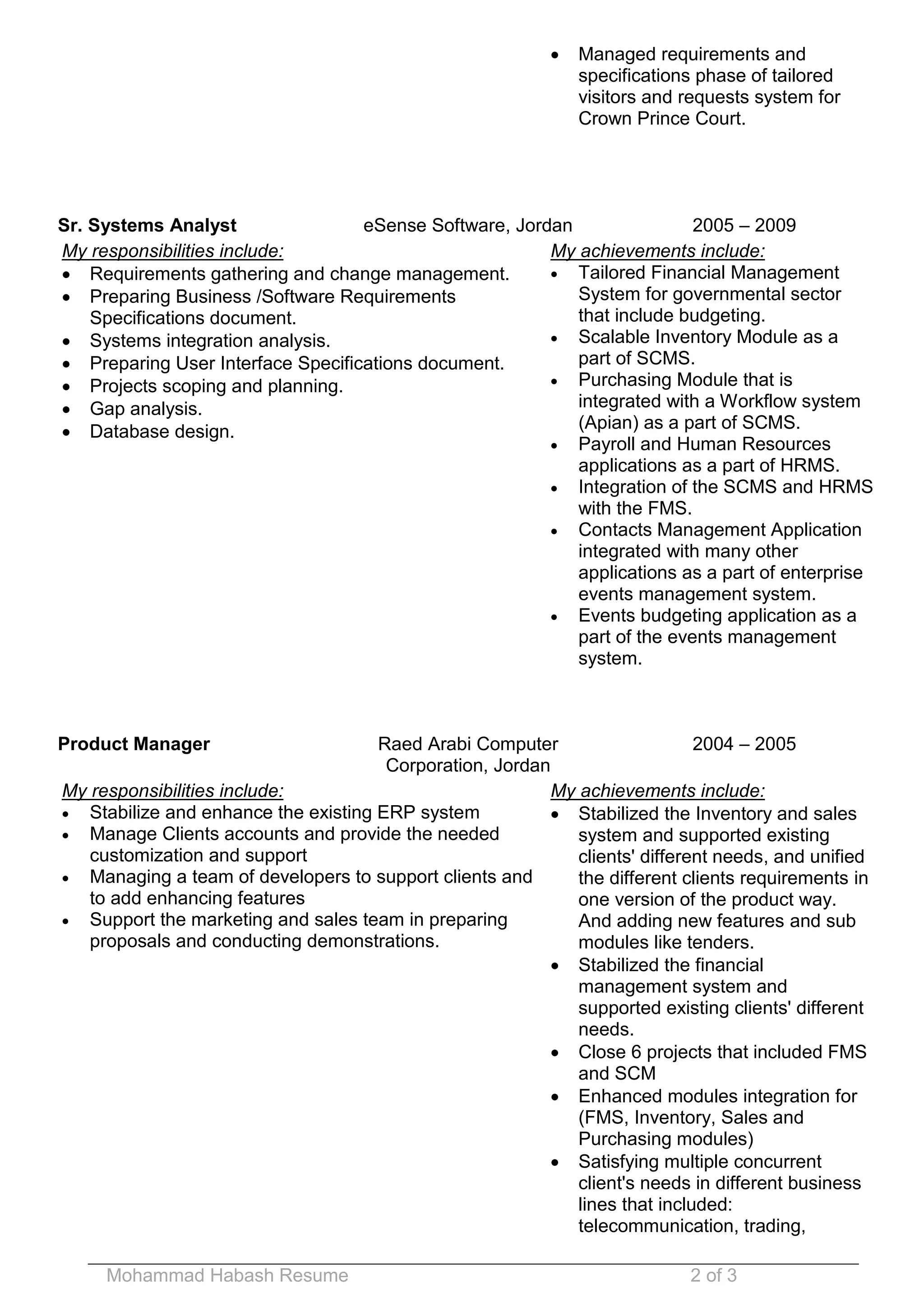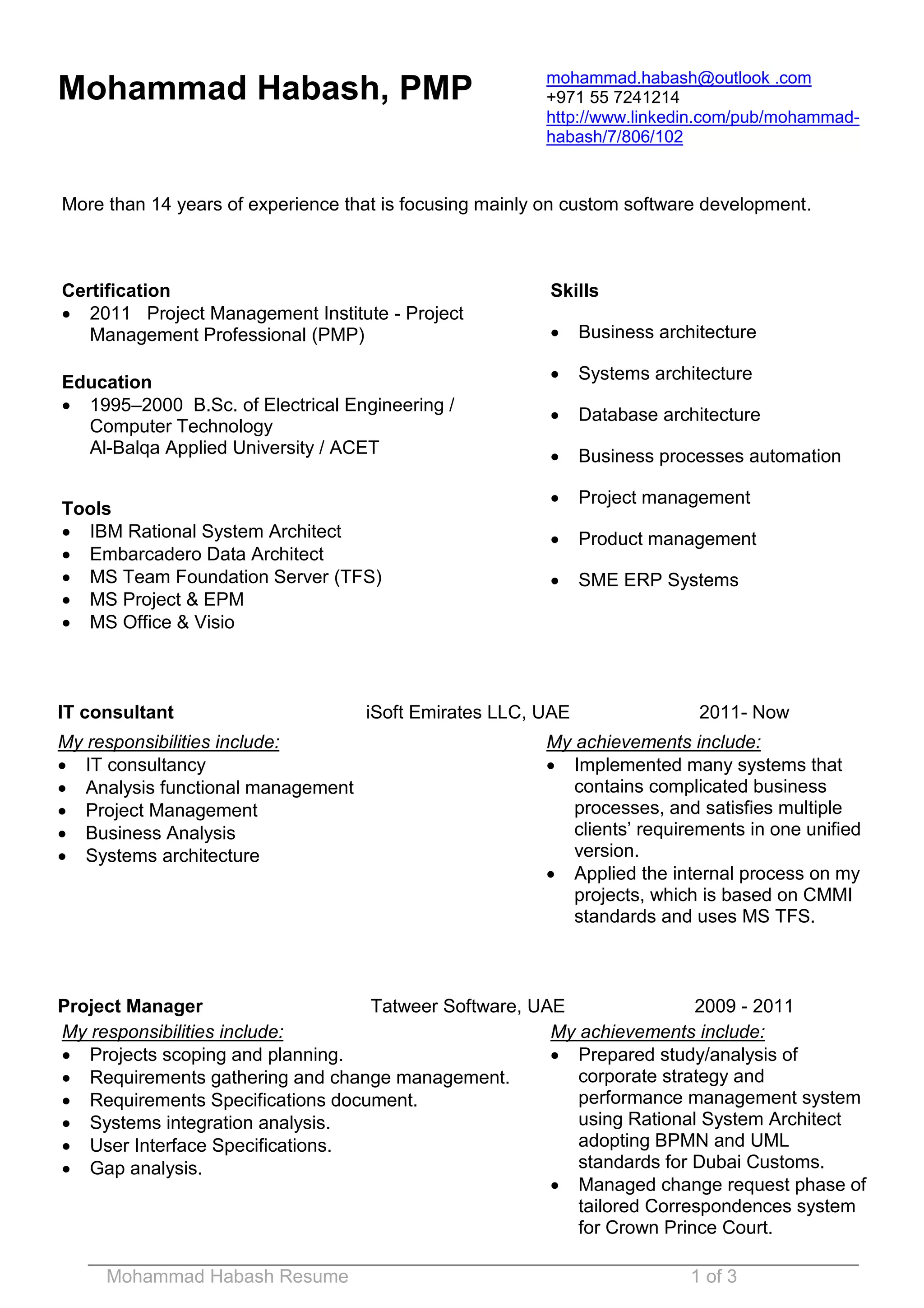 This resume is for Mohammad Habash, who has over 14 years of experience in custom software development and project management. He holds a B.Sc. in Electrical Engineering and Computer Technology and is a Project Management Professional (PMP) certified. His experience includes roles as an IT consultant, project manager, systems analyst, product manager, database administrator, computer engineer, and training engineer.