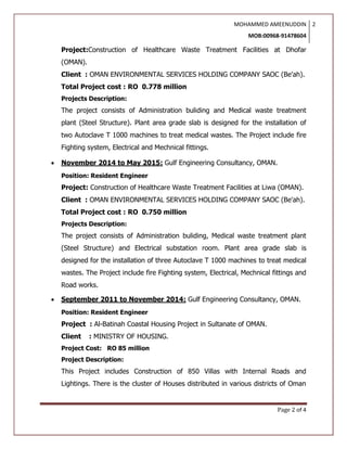 Mohammed Ameenuddin is a civil engineer seeking a position to use his skills in construction management. He has a B.Tech in civil engineering and over 7 years of experience as a resident engineer on healthcare and housing projects in Oman and India. His roles included supervising construction activities, ensuring quality standards, and managing project schedules and budgets. He is proficient in English, has experience with MS Office, and aims to contribute to organizational success through effective teamwork and problem-solving.