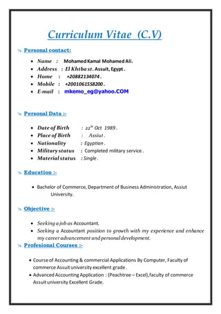 MohamedKamal MohamedAli's CV provides his personal contact information including his name, address, phone numbers, and email. It lists his education as a Bachelor of Commerce in Business Administration from Assiut University in Egypt. His objective is seeking an accountant position to grow his experience and enhance his career advancement.