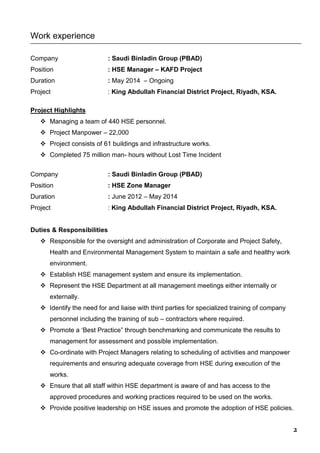 This document is a curriculum vitae for Mohammed Khaled Nawwaf AL Omari. It summarizes his experience and qualifications. He has over 15 years of experience in health, safety, and environment roles in Saudi Arabia and the Middle East. His most recent role was as an HSE Manager for a large project in Saudi Arabia, where he managed a team of 440 staff and ensured the completion of 75 million man-hours without a lost time incident. He holds several health and safety qualifications and certifications.