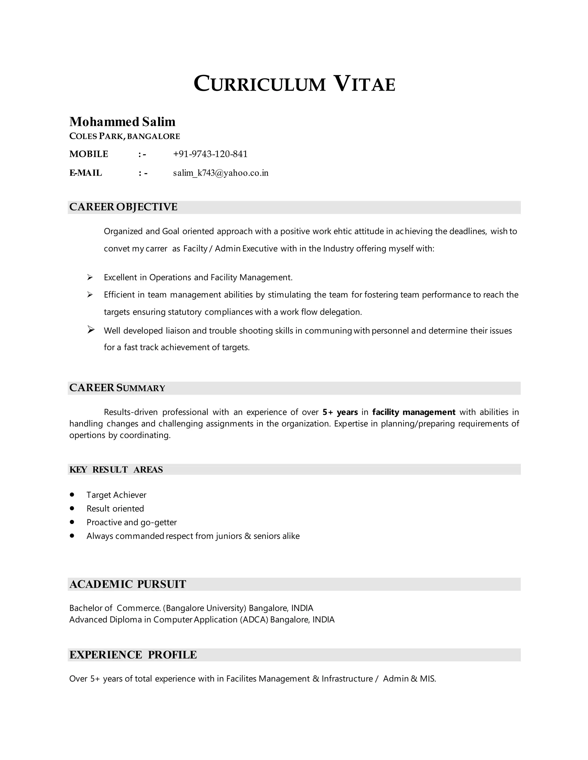 This document is a curriculum vitae for Mohammed Salim. It summarizes his career objective of becoming a facility or admin executive. It outlines over 5 years of experience in facility management, including roles as a helpdesk executive at Yahoo and Accenture and as a process executive at Kempegowda International Airport. It also lists his academic qualifications and skills certifications.