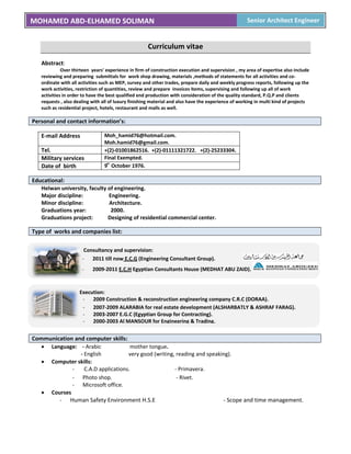 Mohamed Abd-Elhamed Soliman has over 13 years of experience in construction project execution and supervision. He has worked as a senior architect engineer on mega residential projects consisting of villas, townhomes, and malls. His responsibilities included coordinating activities, reviewing submittals, supervising work, and preparing progress reports. He is proficient in CAD applications, scheduling software, and Microsoft Office. Soliman holds a bachelor's degree in engineering from Helwan University and is fluent in Arabic and English.