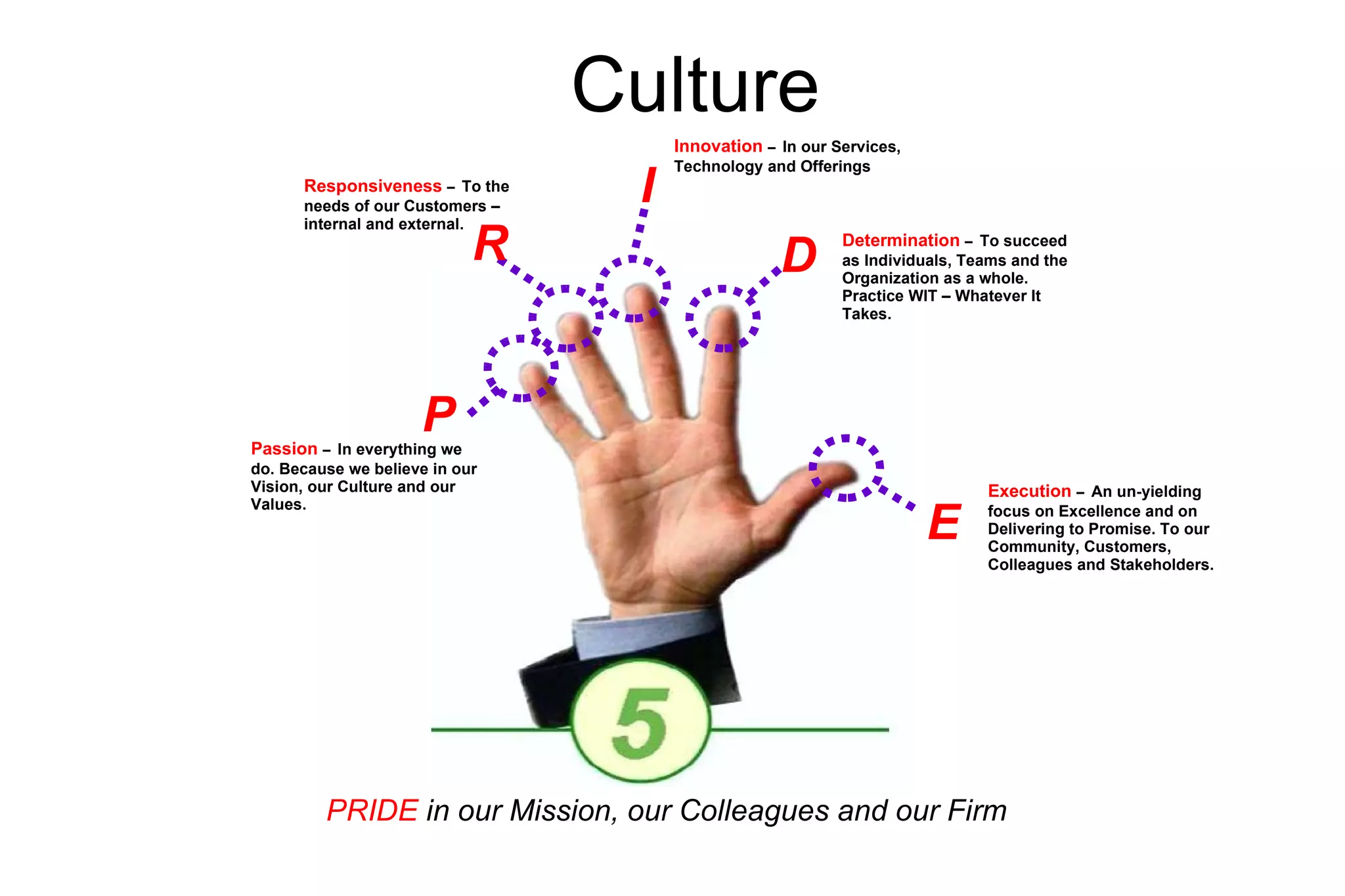 This document outlines the culture of an organization focused on pride, passion, responsiveness, innovation, determination, execution and community. Key values include taking pride in the mission, colleagues and firm, being responsive to customer needs, innovating services and technology, having determination to succeed individually and as a team, and having an unyielding focus on excellence and delivering results for stakeholders.