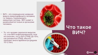 Документ освещает вирус иммунодефицита человека (ВИЧ), его происхождение и стадии развития инфекции. ВИЧ может привести к СПИДу, но между заражением и развитием болезни проходит значительное время. Лечение ВИЧ-инфекции и СПИДа стало более эффективным, что позволяет людям жить дольше и ощущать себя здоровыми.