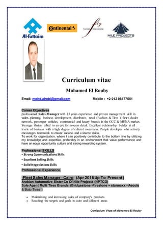 Mohamed El Rouby is a professional sales manager with 15 years of experience in sales, business development, and management in the GCC and MENA regions. He has held positions such as Fleet Sales Manager for Arabian Automotive in Cairo, Area Sales Manager for Future Automotive and Tyres Trading Egypt, and Store Manager for Fashion International Group. He aims to utilize his expertise and knowledge to positively contribute to an organization's bottom line.