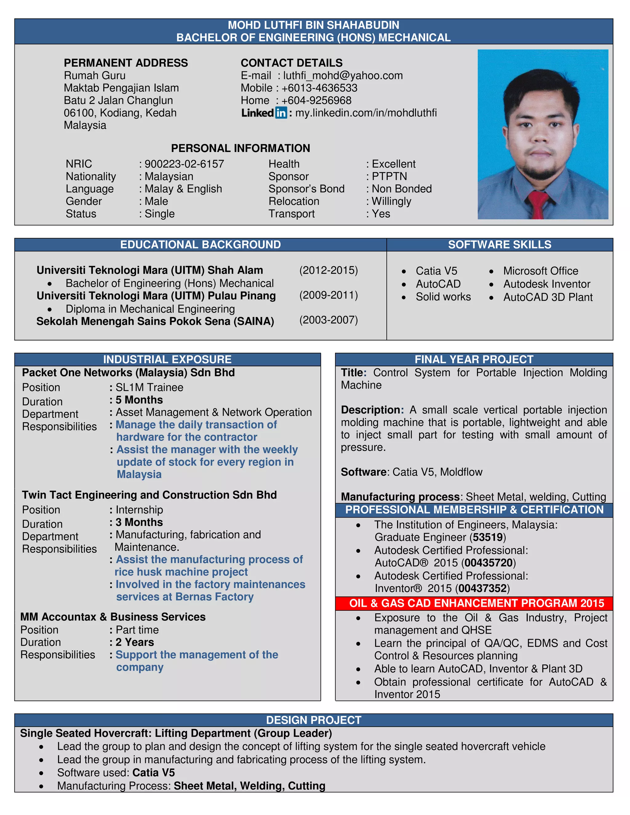 Mohd Luthfi Bin Shahabudin is applying for an entry-level job and provides his resume and cover letter. He graduated with a Bachelor's degree in Mechanical Engineering from Universiti Teknologi MARA. He has relevant work experience in asset management, manufacturing, and business services. He is seeking to further develop his engineering skills and build his career by joining the company. He highlights his strengths such as industrial exposure, software skills, design projects, and achievements which could benefit the company. He looks forward to an interview to discuss career development opportunities.