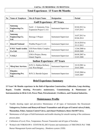 Mohd Mustaque Alam is applying for the position of Instrument Supervisor and has over 13 years of experience in instrumentation for oil, gas, petrochemical, fertilizer, and chemical industries. He has worked on projects in the UAE, Saudi Arabia, Nigeria, and India as an Instrument Supervisor. His experience includes commissioning, calibration, loop checking, troubleshooting, and preventive maintenance of various field instruments and control systems. He is proficient in shutdown work, fire and gas systems, and using test instruments for calibration and commissioning.
