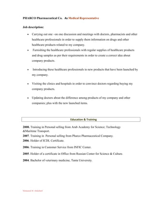Mohamed Mahmud Abdul-Latif is seeking new challenges in marketing at a managerial level. He has over 10 years of experience as a Product Manager and Medical Representative at PHARCO Pharmaceutical Co. in Egypt, where he was responsible for marketing ophthalmological and internal medicine products, providing technical expertise and information to sales teams, and maintaining relationships with healthcare professionals. He holds a Bachelor's degree in veterinary medicine from Tanta University in Egypt.
