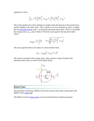 Mohr's circle is a graphical representation that illustrates the relationships between normal and shear stresses or strains at a point. It shows the two principal stresses or strains and the maximum shear stress or strain. The circle is centered at the average stress or strain and has a radius equal to the maximum shear value. Mohr's circle can be used to determine principal stresses/strains and directions, transform between stress/strain systems, and visualize how stresses/strains change with rotation. It remains a useful tool for engineers despite the availability of calculators.