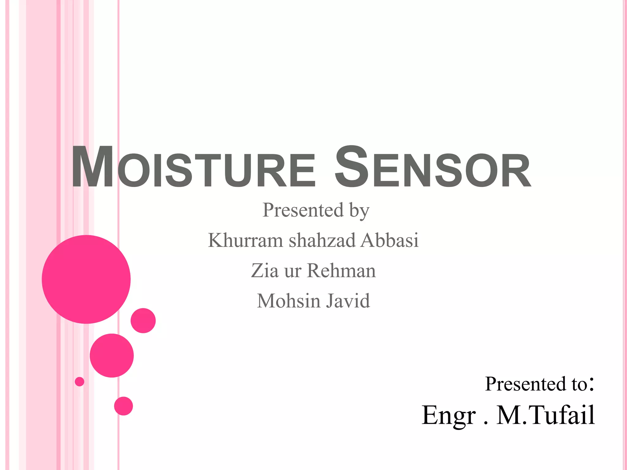 This document describes a moisture sensor circuit that uses an operational amplifier (IC 741) and transistors (BC547) to indicate the presence of moisture. When moisture is detected by the sensor, the op-amp changes states and turns on a green LED while turning off a red LED. The circuit diagram and components used are shown. It then explains how the op-amp acts as a voltage comparator and how the transistors are used to switch the LEDs on and off depending on the sensor reading. Finally, some applications of moisture sensors are listed such as in chemical processing, weather monitoring, and greenhouse humidity control.