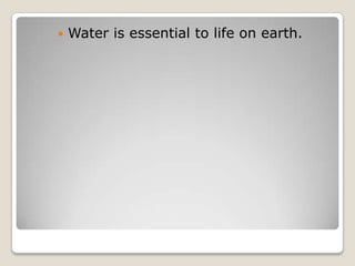 Water has unusual properties like surface tension and the ability to moderate temperatures on Earth because its polar molecular structure allows it to form hydrogen bonds with other water molecules. These hydrogen bonds give water high heat capacity and allow it to absorb large amounts of heat with only small temperature changes. Water's density maximum at 4°C also contributes to stabilizing ecosystems and preventing abrupt seasonal changes.