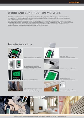 This document provides information on several moisture measuring devices for various materials like wood and construction materials. It describes features of devices like the MoistureMaster which can measure moisture in 56 wood types and 6 building material types without damaging surfaces. It also provides details on the DampMaster Plus for measuring moisture in wood, plaster and building materials with accuracy down to 0.5% for various materials. Technical specifications and included components are listed for each device.