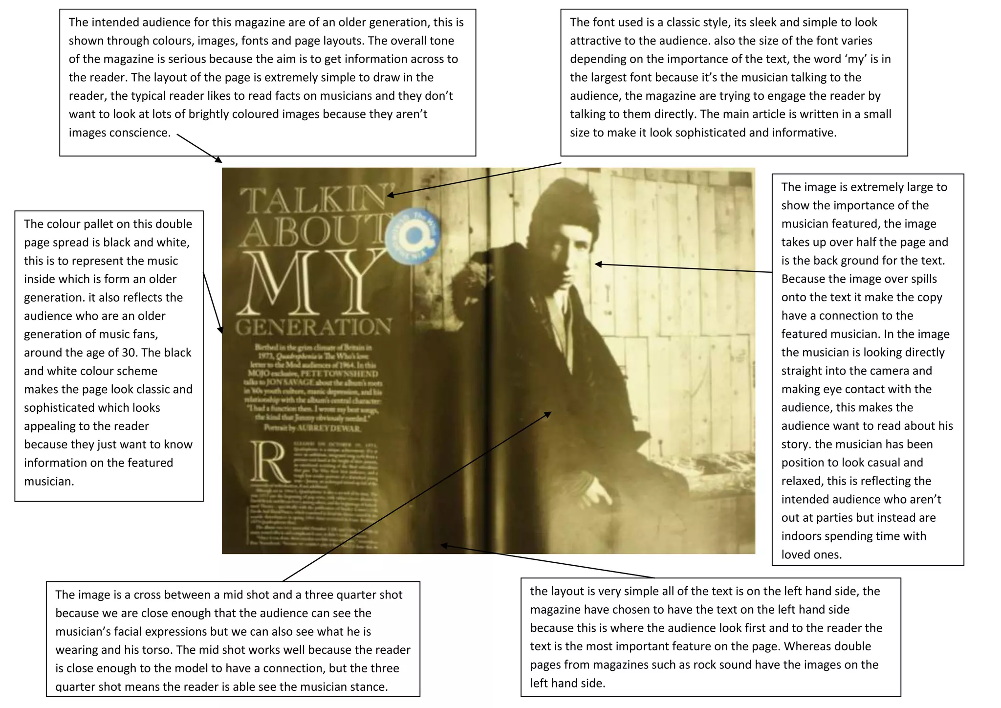 The magazine is aimed at an older generation of music fans. It uses a classic font style and layout with simple images to appeal to its mature audience. The overall tone is serious, aiming to inform readers about musicians. Large images and fonts are used for important elements, while other text is smaller to seem sophisticated.