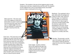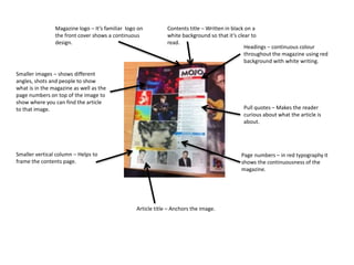 The document describes the key design elements of a magazine cover and interior pages. These include the strapline at the top with prizes and articles, the masthead in bold font identifying it as a music magazine, and the main cover line in bold and larger font. The cover uses multiple lines of small text in colors that blend with the black and white background. Interior pages use headings in red, images and pull quotes to entice readers, and bold text within articles to distinguish quotes from the interviewee.