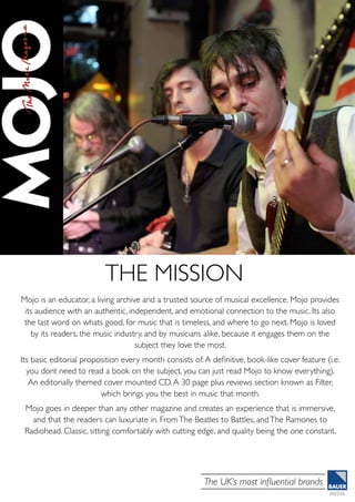 Mojo is a UK-based music magazine known for its in-depth coverage of music across genres and decades. It aims to provide an authentic connection to music for passionate fans through long-form journalism, photography, and curated playlists. With a circulation of nearly 95,000 and a readership of over 200,000, Mojo's audience is predominantly affluent and highly influential music enthusiasts. The magazine seeks to celebrate both classic and cutting-edge artists through a hand-crafted experience.