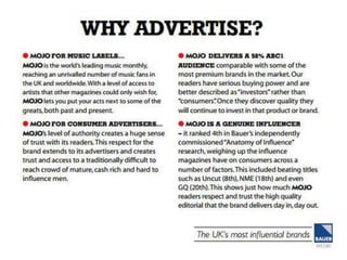 The document discusses the music magazine MOJO. It provides details about its origins, target audience, and content. MOJO focuses on classic rock music and aims to appeal to fans both new and established artists. It encourages readers to explore new and old musical acts through cover choices and free CDs. While some criticize its frequent coverage of classic rock stars, it has also featured newer and more underground artists. The magazine seeks to appeal to traditional fans through classic artists while also attracting new fans through contemporary coverage and special issues.