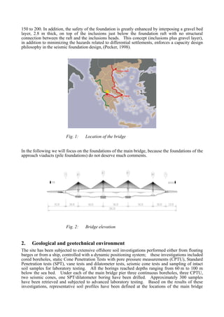 2) Subsurface investigations found deep alluvial deposits with low strength and shear wave velocities, posing challenges for the large bridge piers.
