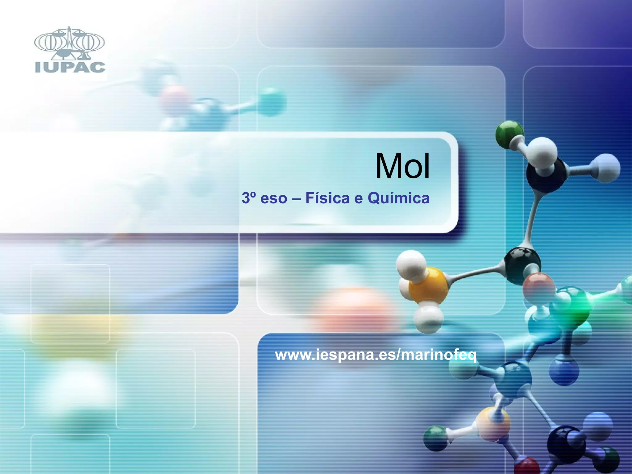 Mol O molO mol é un concepto similar ao de unha ducia, tan só que é moitísimo (pero moitísimo) máis grande Calcula canto tempo necesitarías para contar 1 mol de euros, a razón de 1 millón de euros por segundo 6022 000 000 000 000 000 000 00 1 ducia = 12 1 mol =