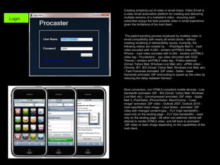 The document discusses a video email automation platform called Video Email that creates and delivers multiple optimized versions of a marketer's video to ensure compatibility with different email clients. It generates various video file formats like MP4, OGV, GIF, PNG, and FLV from an uploaded source video. When a recipient opens the email, the appropriate video file is rendered based on the capabilities of their mail client or browser to provide the best viewing experience.