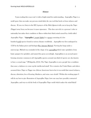 The document discusses the effects of Aspergillus niger mold and its association with mental and physical health issues, arguing that it can lead to a 'black mind' that hinders cognitive function. It explores methods of treatment, including light therapy and holistic approaches, highlighting the importance of eliminating mold from both the home and the body to restore health. The author emphasizes that education and understanding about the mold's impact are crucial for healing and community well-being.