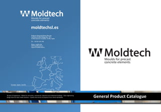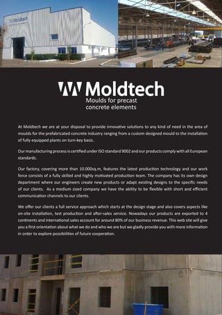 This document provides information about Moldtech SL, a Spanish company that designs and manufactures molds for precast concrete elements. It details the types of molds they produce for industrial, residential, and public works applications. Their products include molds for 3D elements, pre-stressed elements, reinforced elements, columns, walls, floors, and more. The company aims to provide innovative solutions and a full service approach from design to installation and support.