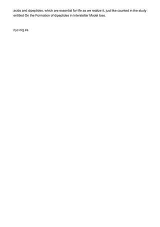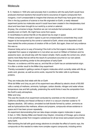 The document discusses experiments that show how organic molecules like amino acids that are fundamental to life could have formed in conditions similar to early Earth or in space. One experiment in the 1950s by Stanley Miller and Harold Urey demonstrated that amino acids and other organic compounds could form by simulating early Earth conditions and subjecting simple molecules like methane and ammonia to electric sparks. A more recent experiment found similar results, showing more complex organic molecules can form when ice mixtures of carbon dioxide, ammonia, and hydrocarbons are bombarded by cosmic rays or electron beams. While the origin of the first organic molecules on Earth is still unknown, these experiments support the possibility that life could have started from compounds formed in space that were delivered