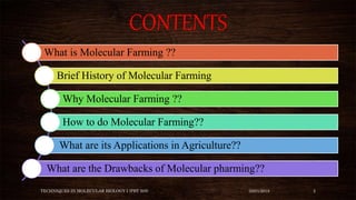 Molecular farming involves using organisms to produce valuable pharmaceutical products through recombinant DNA techniques, presenting a cost-effective alternative to traditional production methods. The document outlines the history, advantages, applications, and challenges associated with molecular farming, including its role in producing vaccines and other therapeutic substances in plants. Additionally, it highlights biosafety and ethical concerns related to the consumption and production processes of these genetically modified organisms.