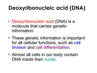The document describes the process of inserting a human insulin gene into bacterial DNA through genetic engineering. First, the insulin gene is cut from human DNA using a restriction enzyme, leaving "sticky ends." A plasmid from bacteria is also cut with the same enzyme. The insulin gene and plasmid are mixed and joined together with the enzyme DNA ligase. The combined DNA is then inserted into E. coli bacteria through applying heat or electric shock to open pores in the bacterial membrane, allowing the plasmid to enter. The engineered bacteria now contains the human insulin gene and can produce human insulin protein.