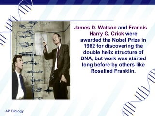 The document discusses the structure and function of DNA, highlighting the discovery of the double helix and the processes of DNA replication, transcription, and translation in protein synthesis. It explains the significance of mutations, including their types, effects on organisms, and examples of genetic disorders caused by mutations. Additionally, the document covers DNA fingerprinting's applications in forensics, paternity testing, and conservation, along with its advantages and challenges.
