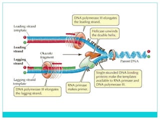 Watson and Crick determined DNA structure is a double helix of nucleotides with bases that pair together. DNA is replicated through a semi-conservative process where each old strand acts as a template for a new complementary strand. Errors during replication can lead to mutations in the DNA sequence. During protein synthesis, the DNA code is transcribed into mRNA which is then translated by ribosomes into a polypeptide chain according to the base sequence of codons.