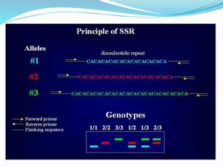 Molecular markers are DNA sequences that can be used to identify differences between individuals. They are found at specific locations in the genome and can be used to track inheritance of traits. Common types include RFLPs, RAPDs, AFLPs, SSRs, and SNPs. RFLPs detect differences in fragment lengths after restriction enzyme digestion and probing. RAPDs use random PCR primers to amplify polymorphic loci. AFLPs combine restriction digestion and PCR to detect multiple loci. SSRs are co-dominant markers based on differences in repeated microsatellite sequences. Molecular markers are powerful tools for genetic mapping, diversity analysis, fingerprinting, and marker-assisted selection.