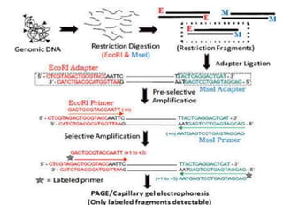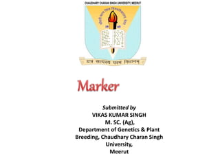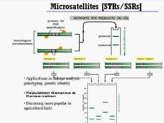 This document provides an overview of different types of molecular markers that can be used in genetics and plant breeding. It discusses morphological markers that are visible traits, as well as several classes of molecular markers including biochemical markers such as allozymes, and DNA-based markers such as RFLPs, microsatellites, AFLPs, STS, and others. The advantages and disadvantages of each type of marker are described. Morphological markers are influenced by the environment while molecular markers directly reflect genotypes. DNA-based markers allow more precise tracking of genetic material and are not affected by the environment.