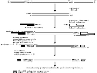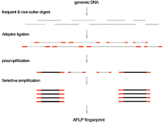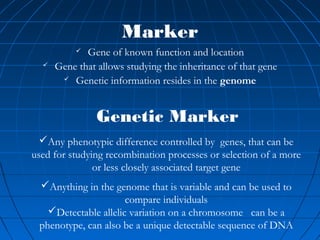 This document discusses genetic markers used in plant breeding. It defines genetic markers as any phenotypic difference controlled by genes that can be used to study inheritance or select for traits. The document describes two main types of genetic markers - morphological markers which are visible traits, and molecular markers which are detected at the DNA level. It provides details on various molecular marker techniques including RFLP, RAPD, AFLP, SSRs, and SNPs. It explains how each technique works and its advantages and disadvantages. The key information is that genetic markers are tools that allow studying inheritance of genes and selecting plants for breeding based on associated genetic differences.