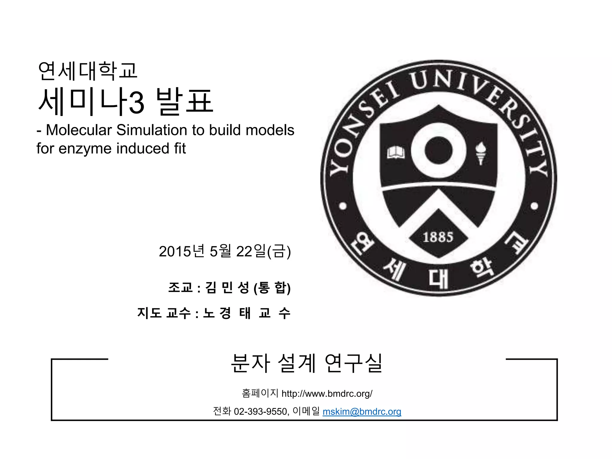 The document outlines the activities and research interests of the Bioinformatics & Molecular Design Research Center, focusing on molecular dynamics simulations, enzyme interactions, and drug design methodologies. It highlights computational techniques used for analyzing molecular behaviors, including various force fields and modeling systems, alongside the applications of high-performance computing in biological research. Additionally, it discusses specific case studies and advancements in molecular modeling and computer-aided drug development.